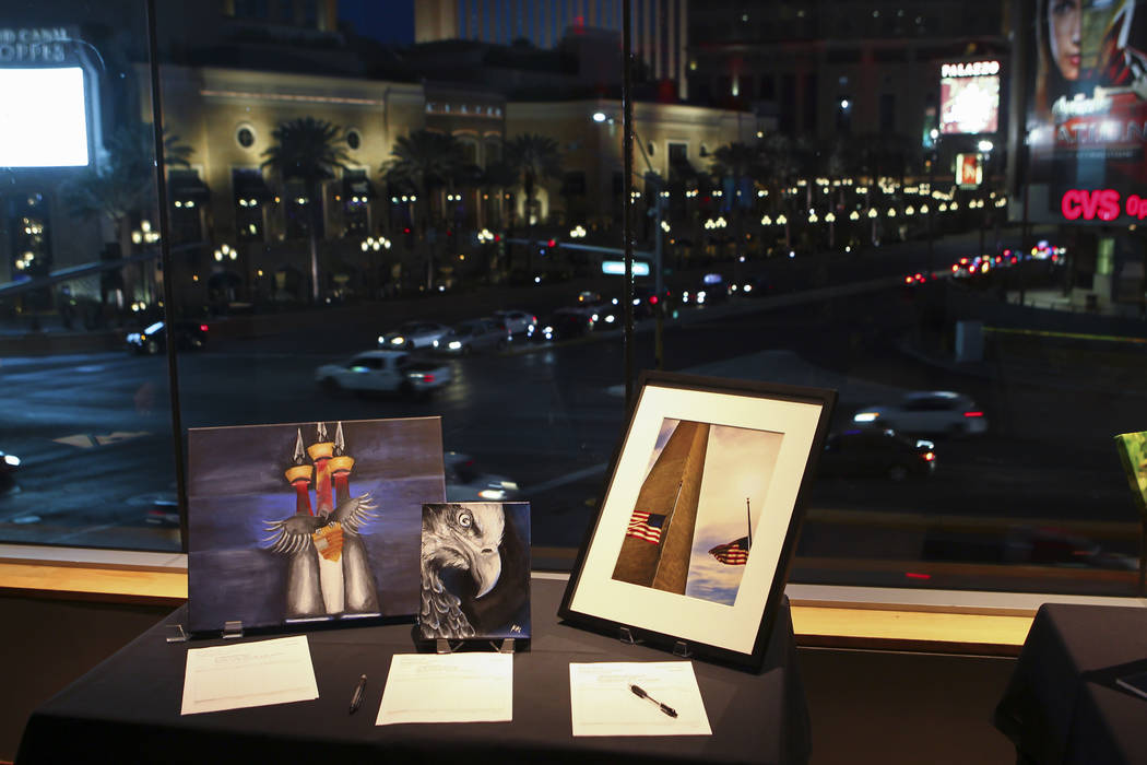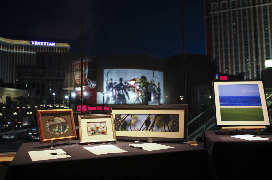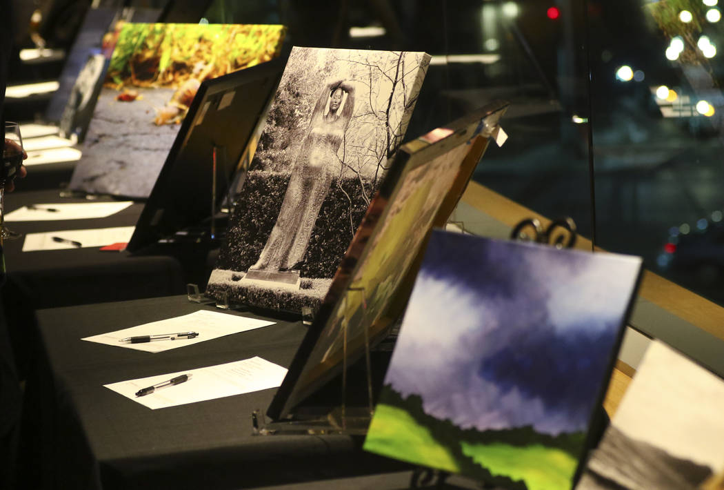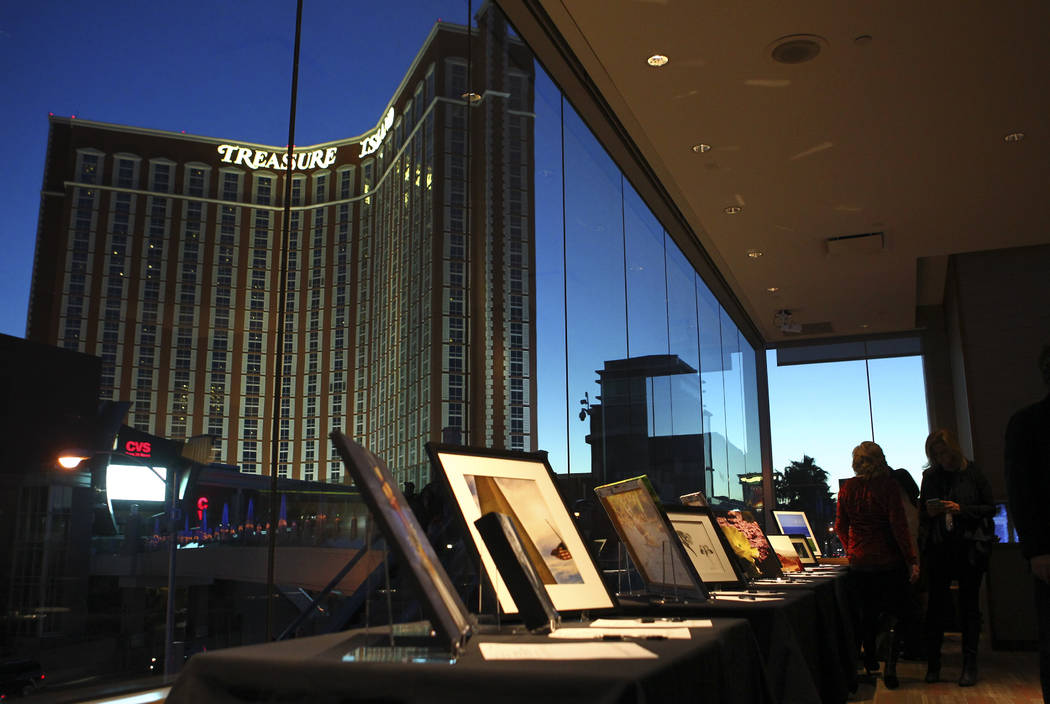 At Neiman Marcus, about 100 people gathered in the posh Mariposa room in full view of the Strip, bidding silently on the two dozen pieces of art as they indulged in wine and appetizers.