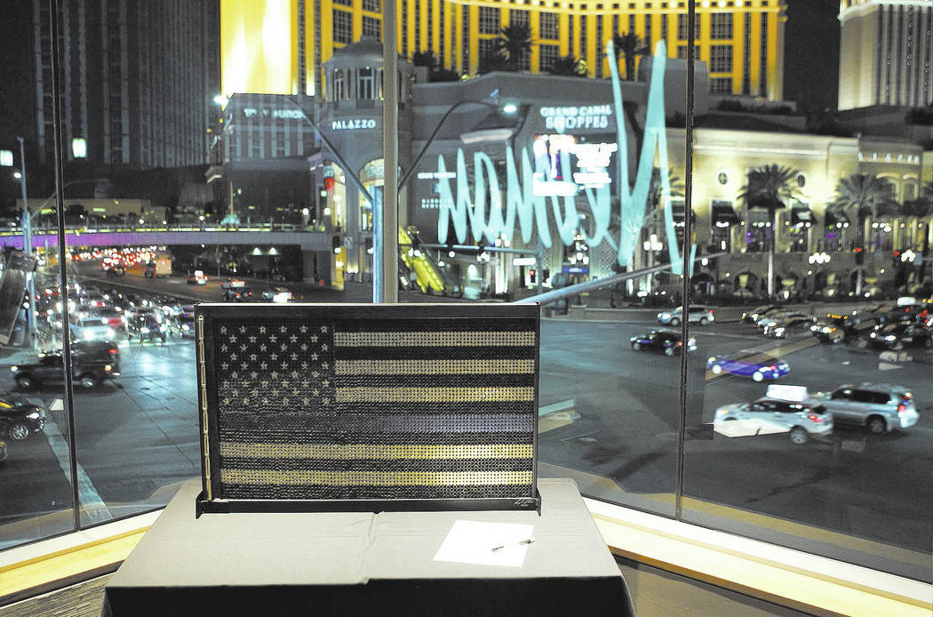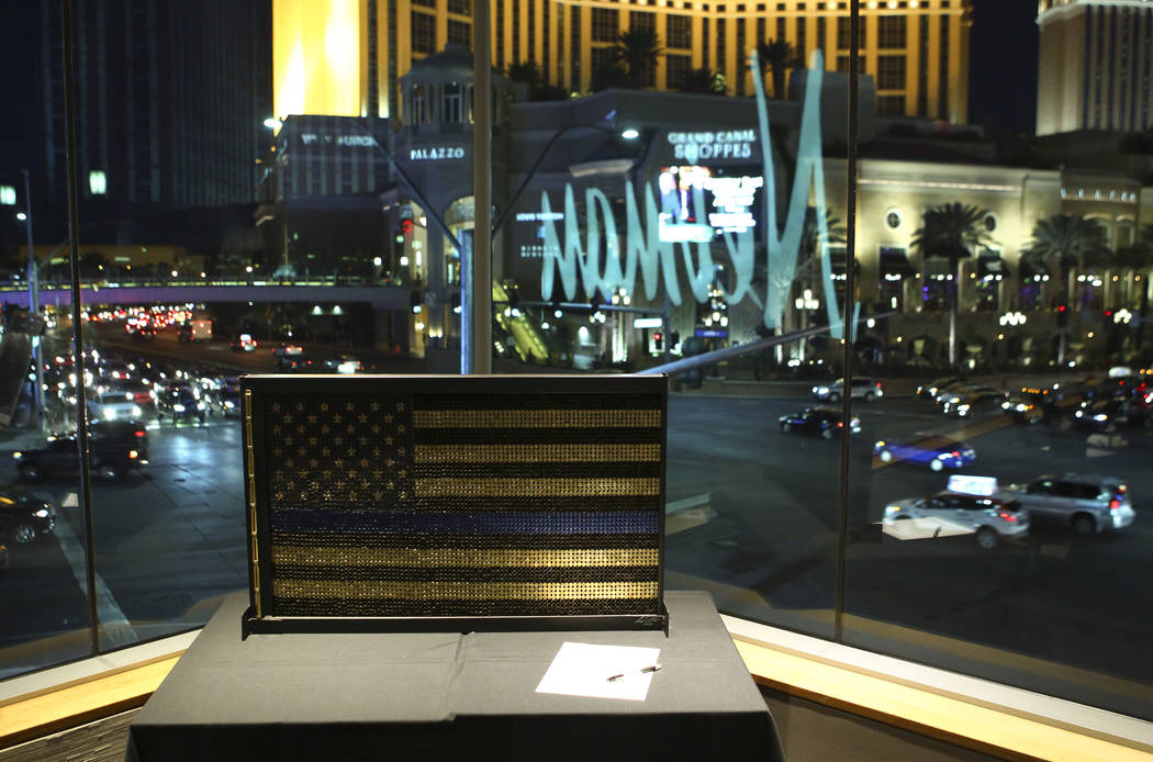 Photographs, paintings and jewelry were among the items up for bid. McDonald’s art piece stood out: a 36-by-20-inch American flag made out of nearly 5,000 9 mm shell casings. “I’d never dealt with that type of medium before. It was something different that I thought would be cool,” McDonald said.