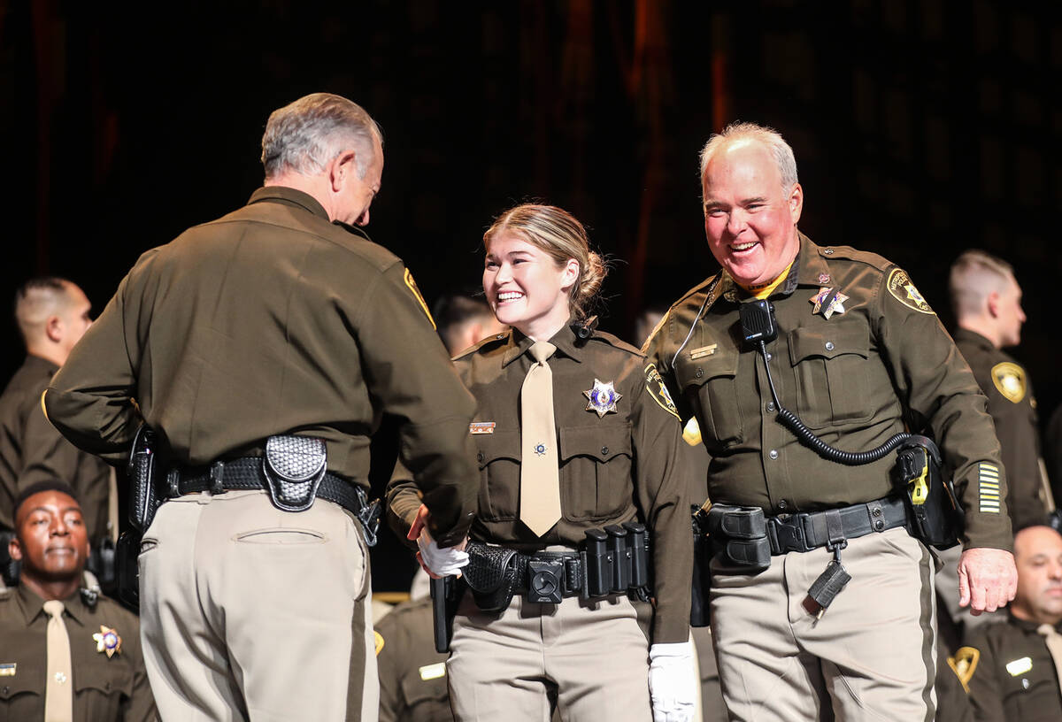 Officer Stephen Kircher, right, stands with his daughter and academy graduate Kirsten Kircher, center, as she shakes hands with Clark County Sheriff Joe Lombardo at the Metropolitan Police Department’s graduation ceremony at The Orleans in Las Vegas on Thursday, Oct. 27, 2022. (Rachel Aston/Las Vegas Review-Journal) @rookie__rae