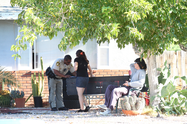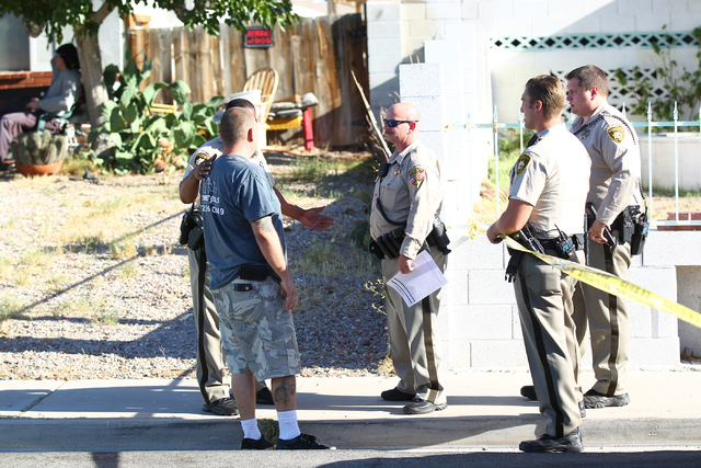 Relatives look on as Las Vegas police investigate a shooting at a home on the 5100 block of Del Rey Avenue, near near Charleston and Decatur boulevards, in Las Vegas on Wednesday, Sept. 3, 2014. The victim was transported to UMC. (Chase Stevens/Las Vegas Review-Journal)
