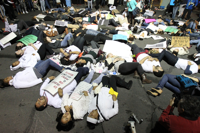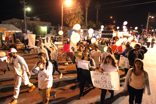 “Black Lives Matter,” nearly 100 protesters shouted as they were lying in the intersection of Casino Center Boulevard and California Avenue. “Brown Lives Matter.”