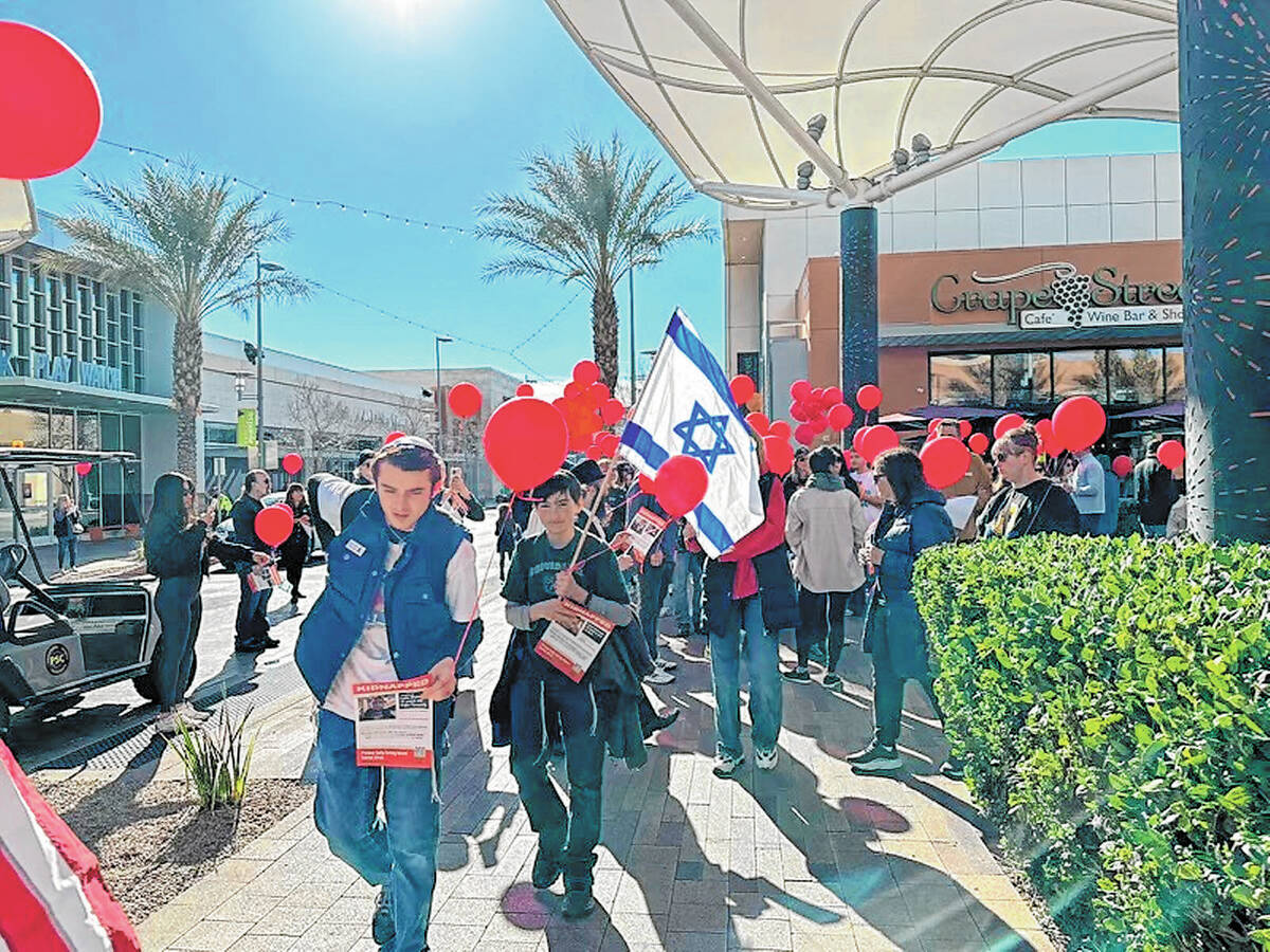 Carrying red balloons and wearing yellow ribbons, both of which symbolize the plight of the hostages, the group walked quietly through downtown Summerlin. The west Las Vegas location was chosen because many community members live in the area, Etzion said.
