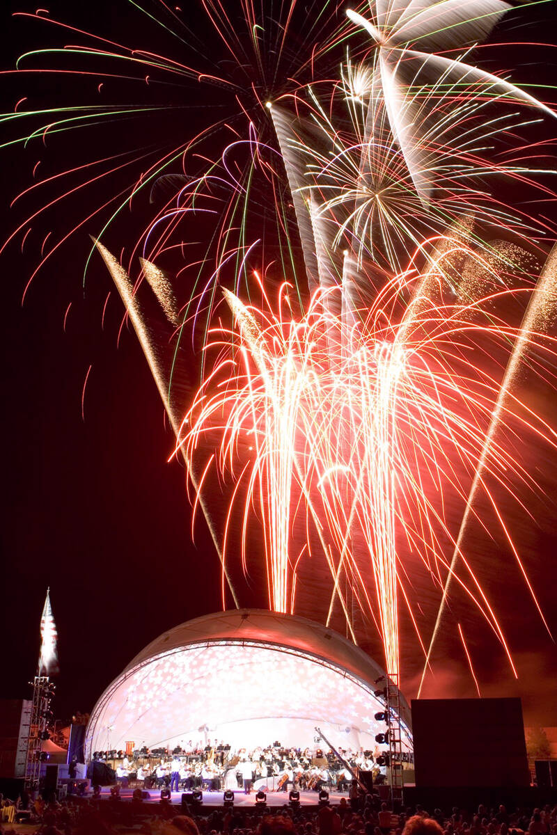 In this July 4, 2005, file photo, the Las Vegas Philharmonic orchestra perform its Star Spangled Spectacular while fireworks blast during the “1812 Overture” finale of its Fourth of July event at Hills Park in Summerlin. (Jeff Scheid/Las Vegas Review-Journal)