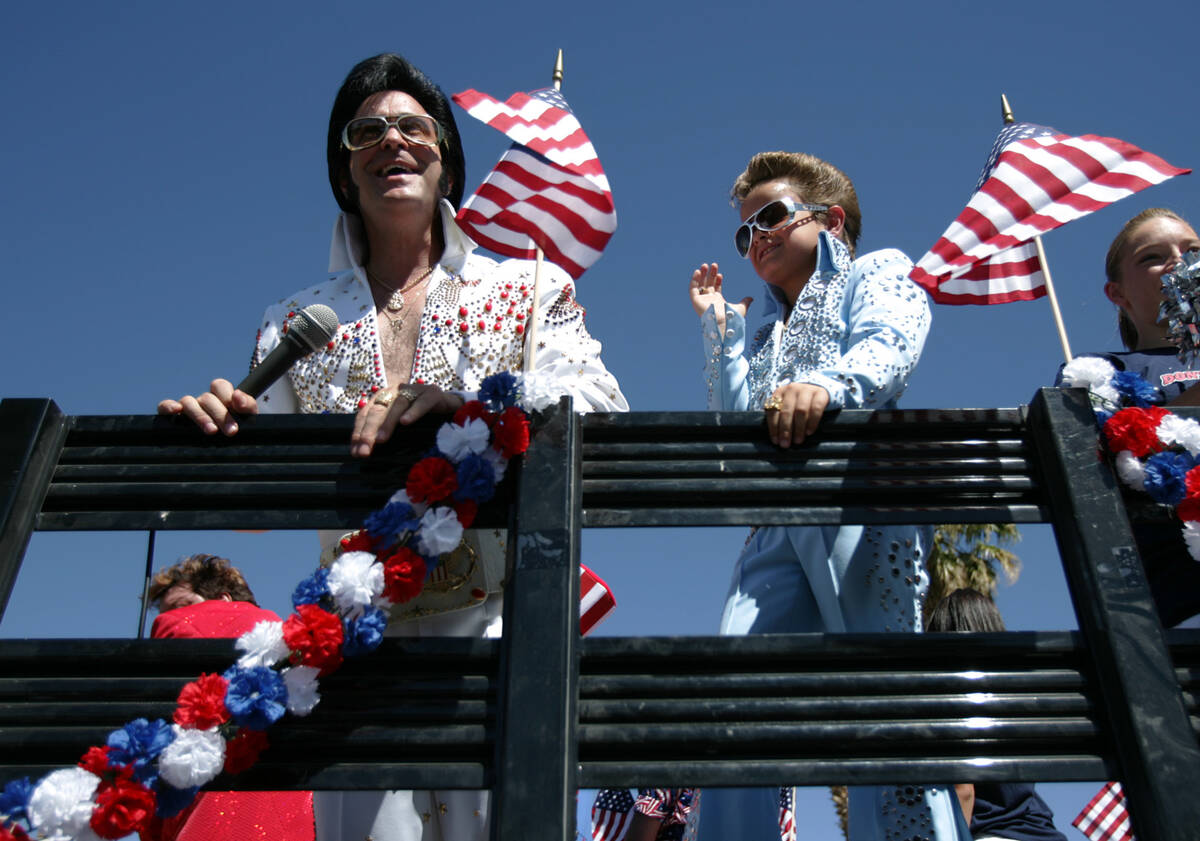 In this July 4, 2007, file photo, Elvis impersonators Don Rose, left, and his seven-year-old son Ryan ride a float during the 59th annual Fourth of July Damboree Parade along Nevada Highway in Boulder City. (Sara Tramiel/Las Vegas Review-Journal)