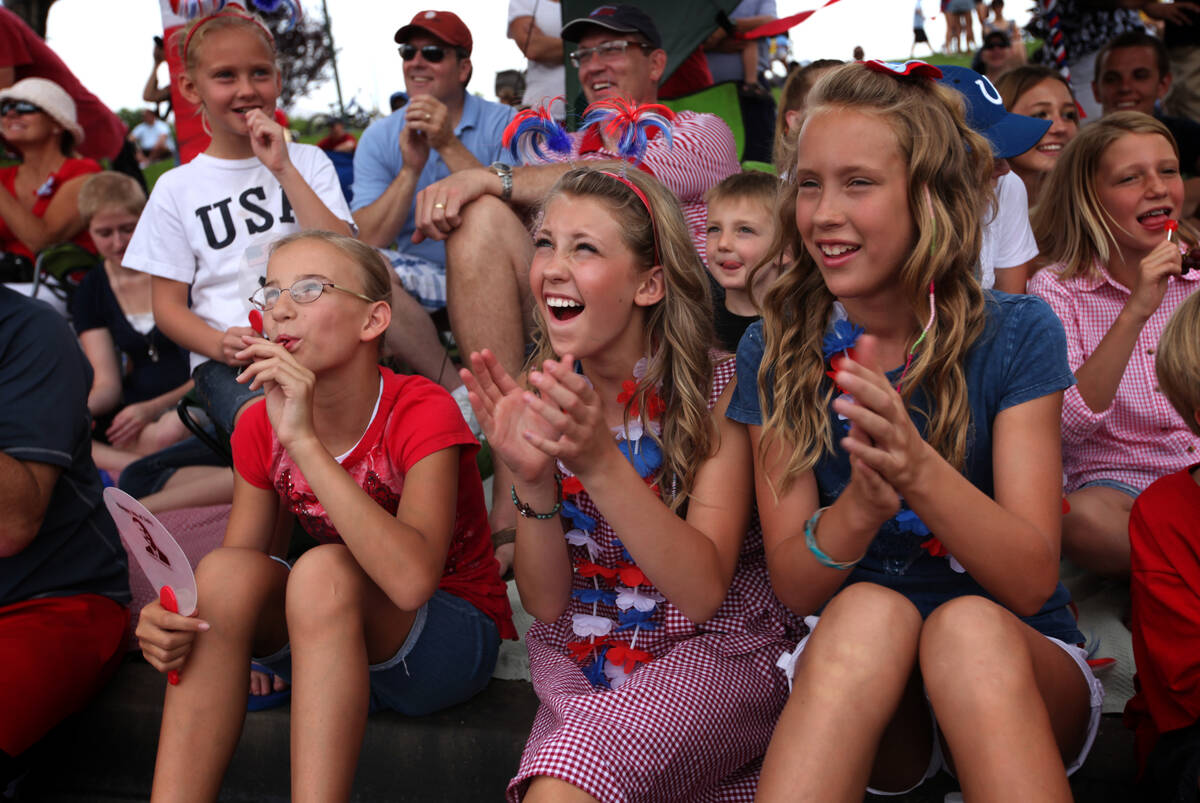 In this July 4, 2011, file photo, Megan Gneiting, 13, center, and Heather Gneiting, 11, right, clap for a float during the 17th annual Summerlin Council Patriotic Parade in Las Vegas. (Jessica Ebelhar/Las Vegas Review-Journal)