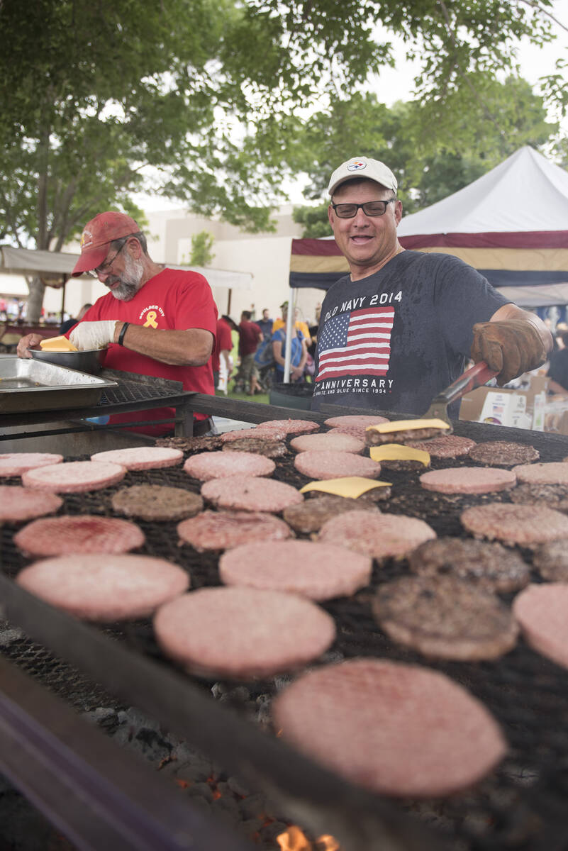 In this July 4, 2015, file photo, Tim Hauter, left, and Ken Morane, members of Elk’s Lodge #1682, prepare hamburgers for Fourth of July celebrants in Broadbent Park during the 67th Annual Boulder City Damboree Celebration in Boulder City. (Jason Ogulnik/Boulder City Review)