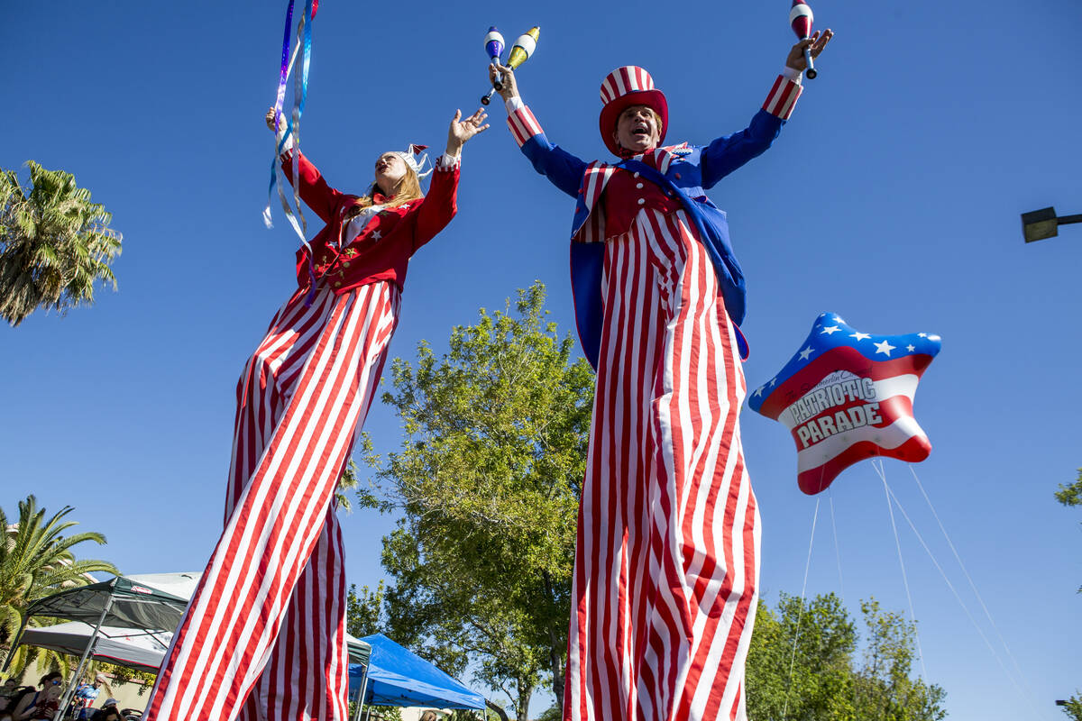 In this July 4, 2017, file photo, patriotic stilt walkers wave to crowds during the Summerlin Council Patriotic Parade in Summerlin. (Patrick Connolly/Las Vegas Review-Journal) @PConnPie