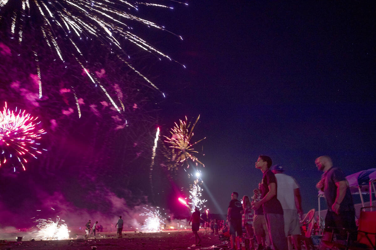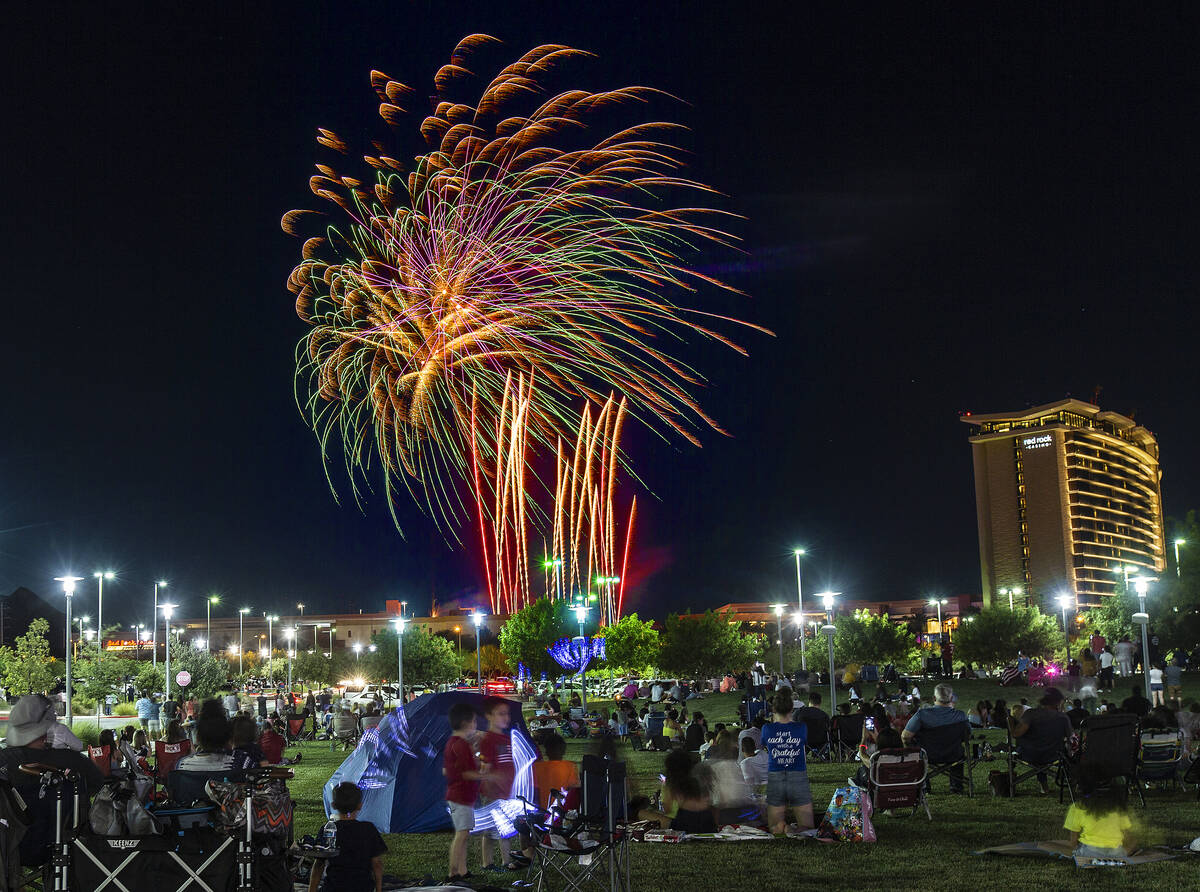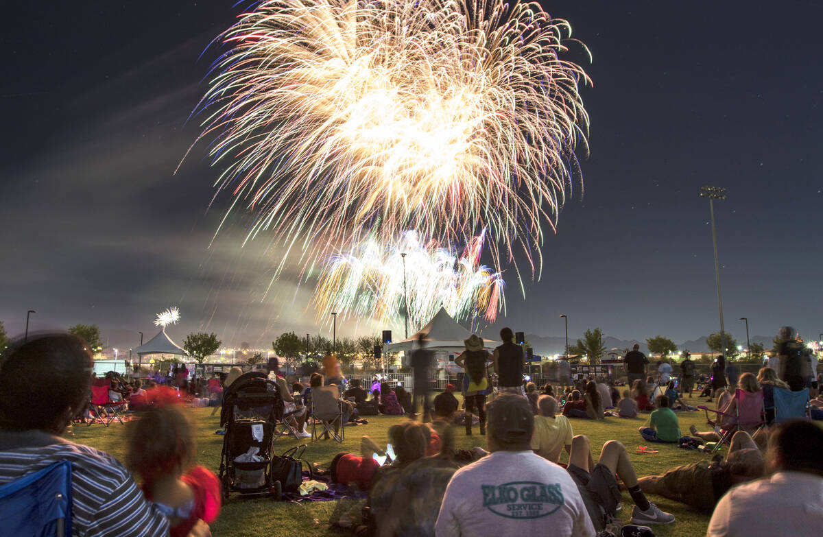 In this July 4, 2017, file photo, people watch fireworks explode during Fourth of July festivities at Heritage Park in Henderson. (Richard Brian/Las Vegas Review-Journal)
