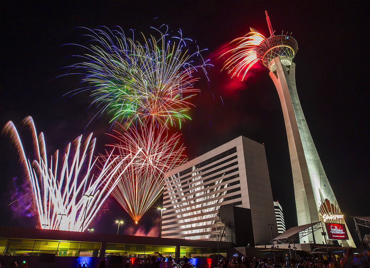 In this July 4, 2018, file photo, Fourth of July fireworks fill the Las Vegas skyline at the Elation rooftop pool at the Stratosphere hotel-casino, in Las Vegas. (Benjamin Hager/Las Vegas Review-Journal) @benjaminhphoto