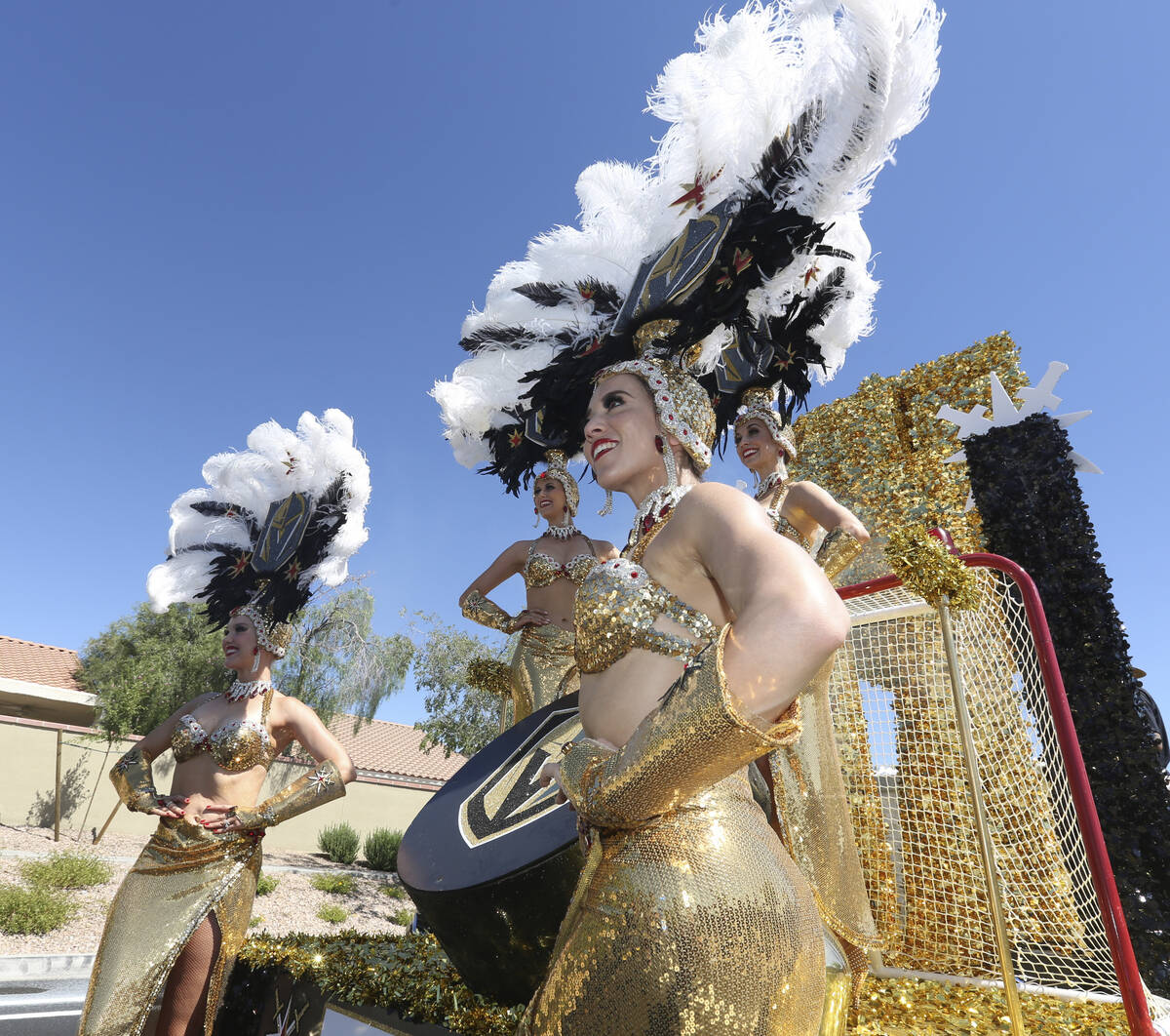 In this July 4, 2019, file photo, Golden Knight showgirls take a group photo during the 25th annual Summerlin Council Patriotic Parade in Las Vegas. (Michael Blackshire/Las Vegas Review-Journal)