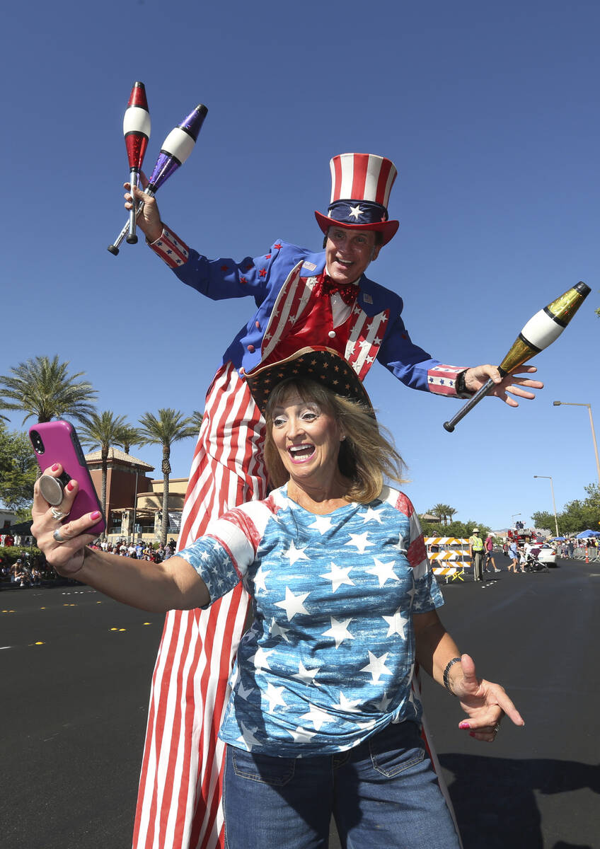 In this July 4, 2019, file photo, Kathy Koch takes a photo with a man dressed as Uncle Sam during the 25th annual Summerlin Council Patriotic Parade in Las Vegas. (Michael Blackshire/Las Vegas Review-Journal)