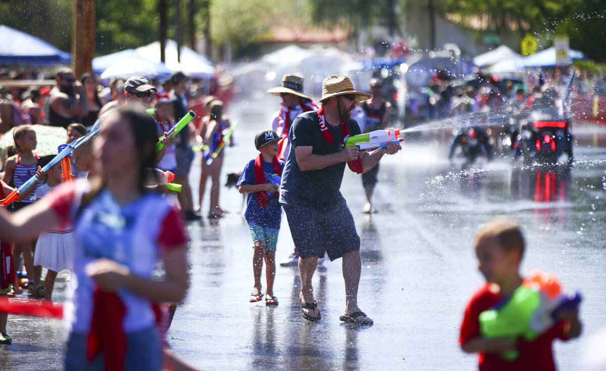 In this July 4, 2019, file photo, spectators partake in water fights during the parade at the annual Damboree Celebration in Boulder City. (Chase Stevens/Las Vegas Review-Journal) @csstevensphoto