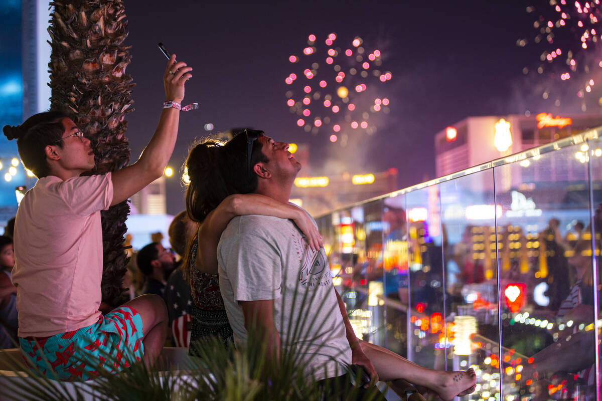 In this July 4, 2021, file photo, fireworks go off along the Las Vegas Strip as people watch from the Boulevard Pool at The Cosmopolitan of Las Vegas. (Chase Stevens/Las Vegas Review-Journal) @csstevensphoto