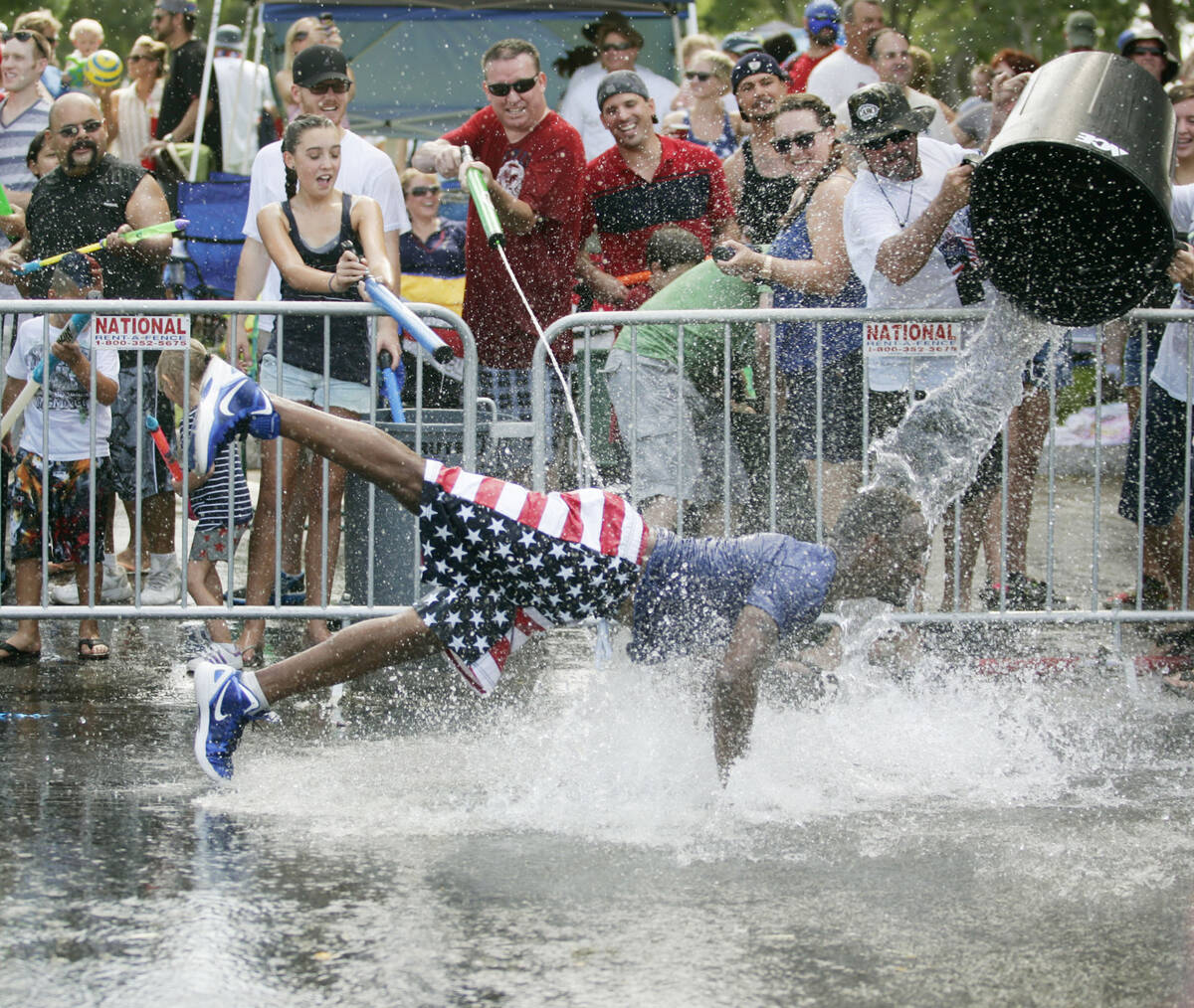 In this Thursday, July 4, 2013, file photo, Roger Johnson, center, is doused with water as he does push-ups for the crowd during the 65th annual Boulder City Damboree Celebration parade on Avenue B in Boulder City. (Ronda Churchill/Las Vegas Review-Journal)