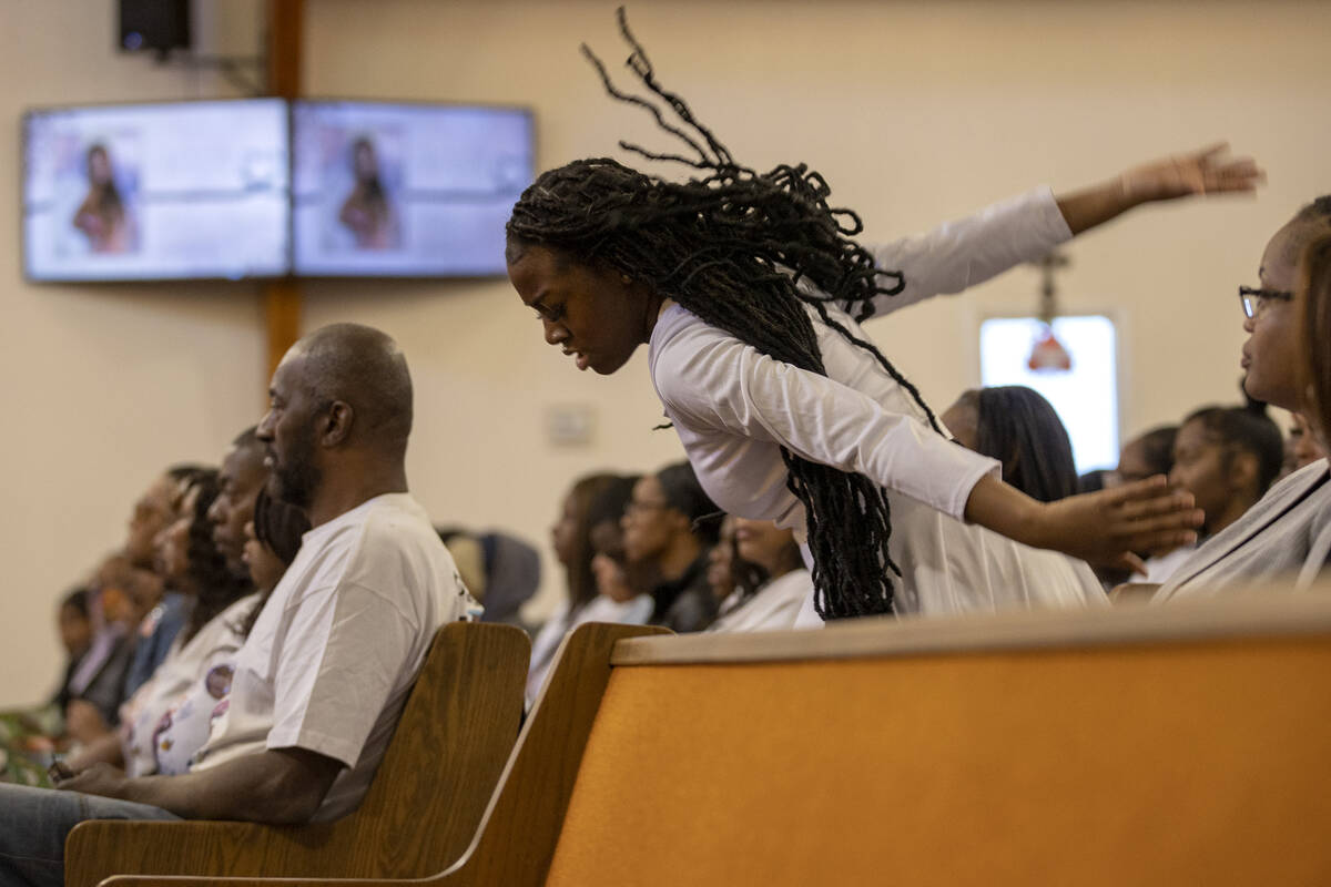 As her acquaintances and friends, including a dozens of students from Desert Oasis High School, passed by her casket, some embracing her family members along the way, church pianist Eli Alford and vocalist Grace Gaston sang, “I’m going up yonder to be with my Lord” from a gospel song by Walter Hawkins.