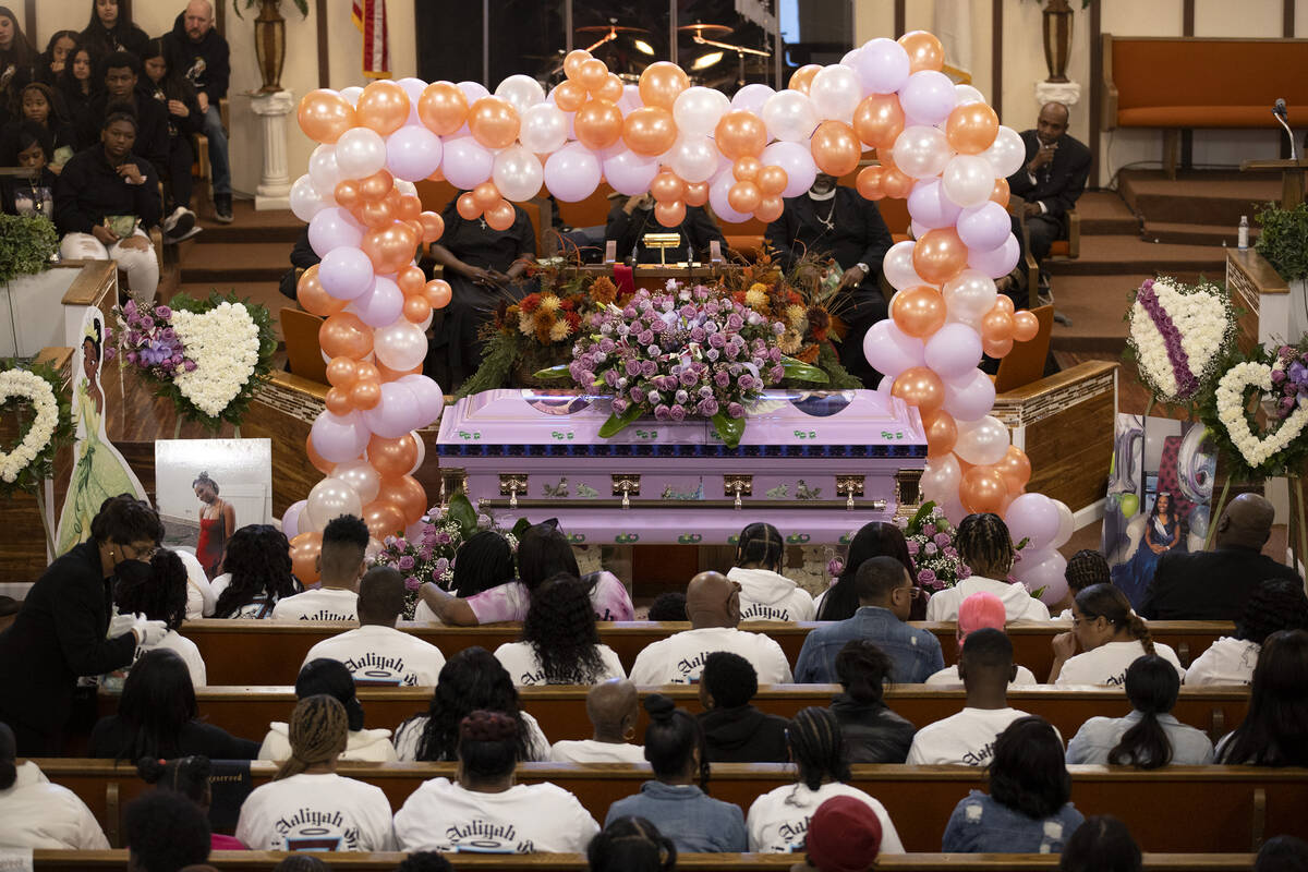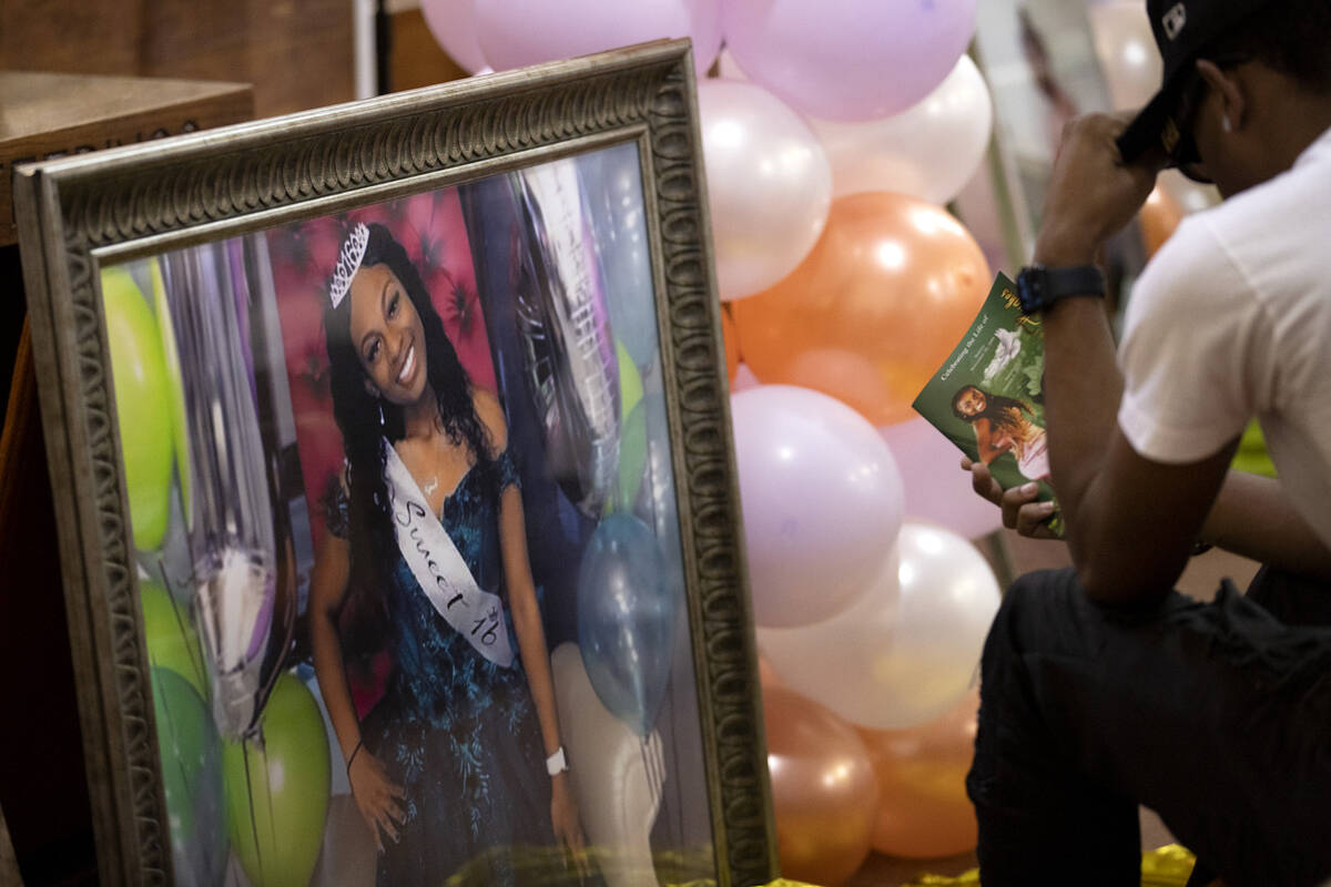 Flanking the pink and gold casket were enlarged photos of the high school sophomore in her homecoming dress and a life-sized cardboard stand-up of the animated Disney character Princess Tiana, a favorite of hers.