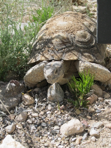 With dirt on top of his shell symbolic of his long winter slumber, Mojave Max emerged at 2:03 p.m. Tuesday from his burrow at Red Rock Canyon in speedy desert tortoise fashion.