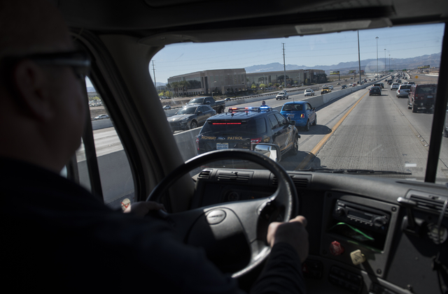 Elevated above Las Vegas motorists on the 215 Beltway, Nevada Highway Patrol Sgt. Michael Cooke said he spotted 48 drivers who were violating the law Wednesday.