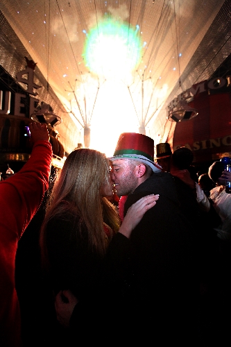Just before midnight, Las Vegas Mayor Carolyn Goodman and her husband, former Mayor Oscar Goodman, toasted in the New Year from the stage between the Four Queens and Fitzgeralds.
