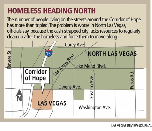 The number of homeless people living on the streets in and around the area, officially called the Corridor of Hope, more than tripled since 2009, according to a January homeless count. Officials say more of them are crossing the street to camp in North Las Vegas, where those who can't -- or don't want to -- get into crowded shelters are more likely to be left alone.