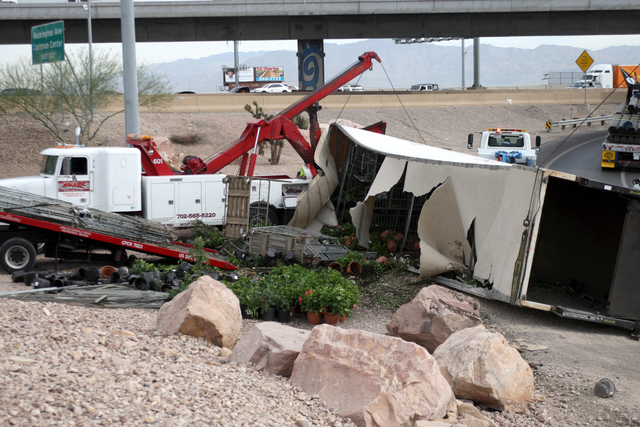 A tractor-trailer overturned Wednesday morning on the ramp of northbound U.S. Highway 95 leading to northbound Interstate 15.