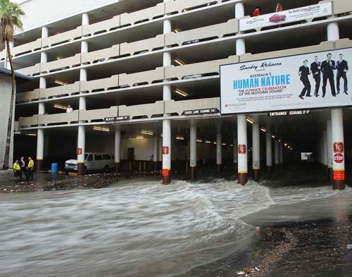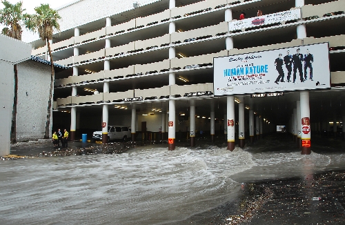 The lower level of the Imperial Palace parking garage on the Strip was hit by floodwaters today as severe thunderstorms struck parts of the Las Vegas Valley.