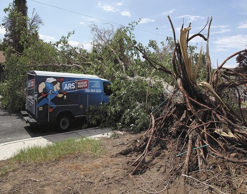 Mother Nature continued her monsoonal assault on Southern Nevada on Sunday, drenching parts of the valley while uprooting trees and knocking down power lines.