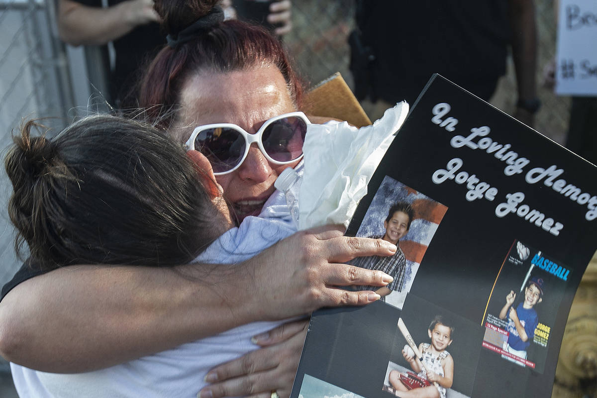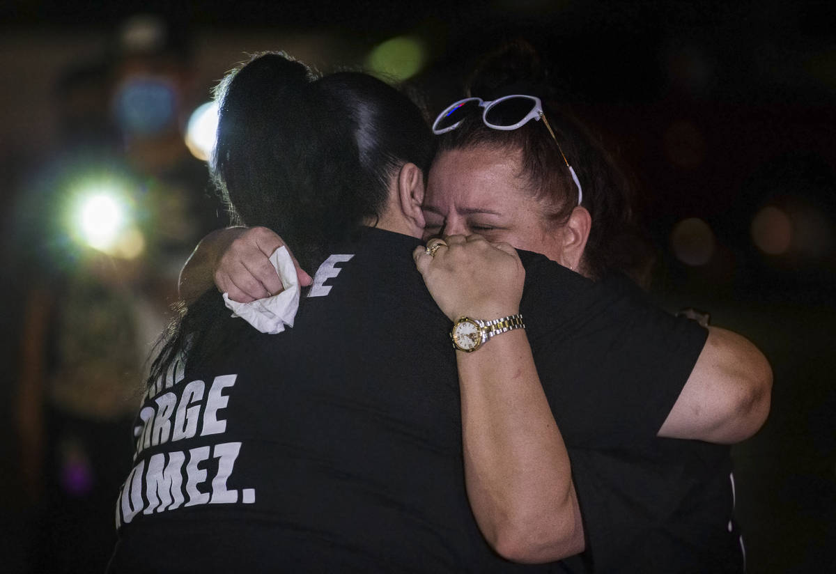 Supporters lit candles and organizers encouraged them to write messages of support on the back of a poster with photos of Gomez. The family spoke through Edgar Flores, who first hosted three minutes of silence, first for the Black Lives Matter movement, for Las Vegas police officer Shay Mikalonis and then for Gomez.
