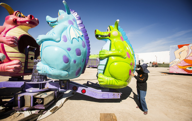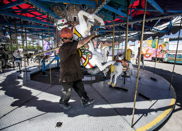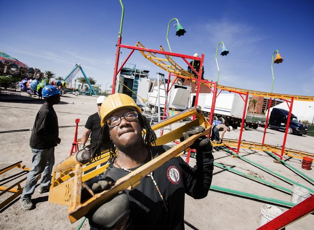 Workers prepared Tuesday for the Las Vegas Helldorado Days on Grand Central Parkway adjacent to The Smith Center for the Performing Arts. The 80-year-old event is open Wednesday through Sunday.