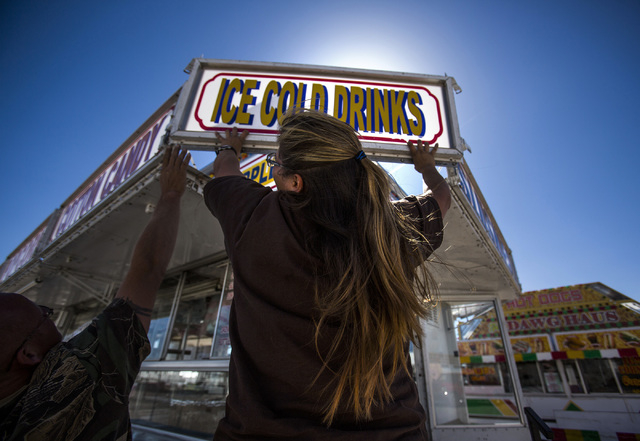 Dalinda Burk places a sign at the Sugar Shack concession at the site of the Las Vegas Helldorado Days on Grand Central Parkway, adjacent to The Smith Center for the Performing Arts on Tuesday, May, 13, 2014. (Jeff Scheid/Las Vegas Review-Journal)