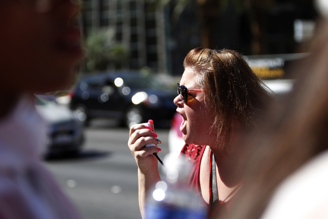 Labor representative Christa Indriolo yells a chant during a rally and march by the California Nurses Association/National Nurses Organizing Committee on the Strip near Planet Hollywood casino-hotel in Las Vegas Wednesday, Sept. 24, 2014. Registered nurses and health workers participated in the action on the Strip to highlight the need for more support to combat infectious diseases around the world such as the Ebola outbreak. (Erik Verduzco/Las Vegas Review-Journal)