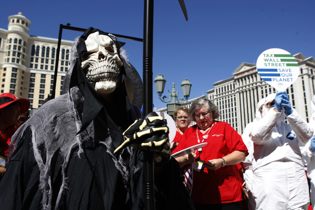 Communications employee Martha Wallner as grim reaper, stands on the Strip near Planet Hollywood casino-hotel during a rally and march by the California Nurses Association/National Nurses Organizing Committee in Las Vegas Wednesday, Sept. 24, 2014. Registered nurses and health workers participated in the action on the Strip to highlight the need for more support to combat infectious diseases around the world such as the Ebola outbreak. (Erik Verduzco/Las Vegas Review-Journal)