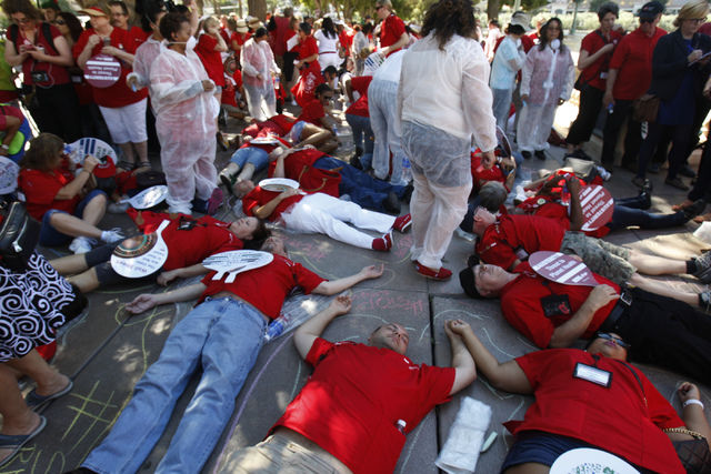Registered nurses and health workers with the California Nurses Association/National Nurses Organizing Committee lay down on the ground to represent the lives lost from infectious diseases around the world during a rally and march on the Strip in Las Vegas Wednesday, Sept. 24, 2014. The group participated in the action to highlight the need for more support to combat infectious diseases around the world such as the Ebola outbreak. (Erik Verduzco/Las Vegas Review-Journal)