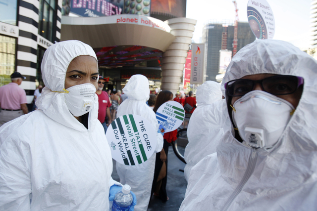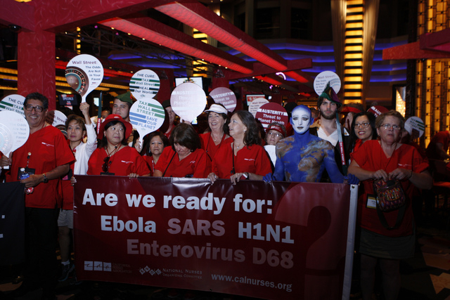 Registered nurses with the California Nurses Association/National Nurses Organizing Committee rally outside of Planet Hollywood casino-hotel in Las Vegas Wednesday, Sept. 24, 2014. Registered nurses and health workers participated in the action on the Strip to highlight the need for more support to combat infectious diseases around the world such as the Ebola outbreak. (Erik Verduzco/Las Vegas Review-Journal)