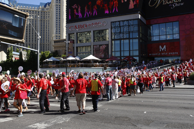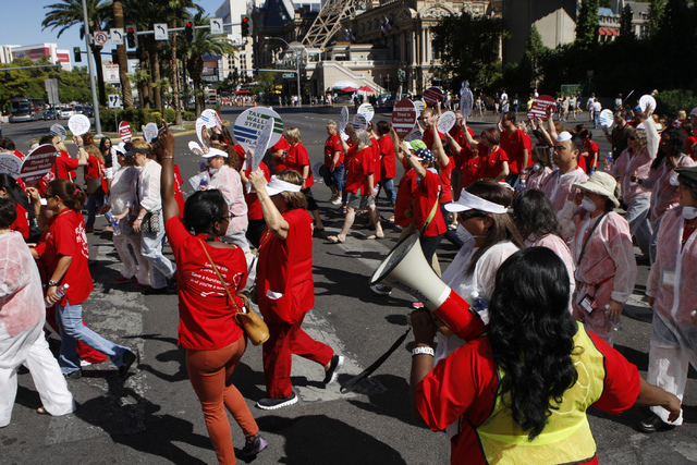 Traffic is stopped for members of the California Nurses Association/National Nurses Organizing Committee as they return to Planet Hollywood casino-hotel for their convention from a rally and march on the Strip in Las Vegas Wednesday, Sept. 24, 2014.Registered nurses and health workers participated in the action on the Strip to highlight the need for more support to combat infectious diseases around the world such as the Ebola outbreak. (Erik Verduzco/Las Vegas Review-Journal)