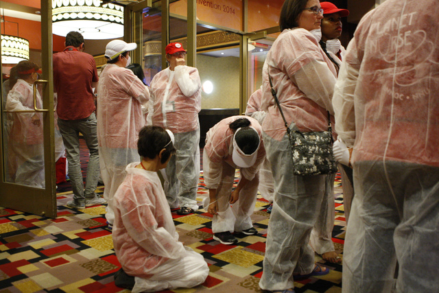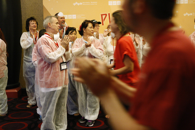 Registered nurses with the California Nurses Association/National Nurses Organizing Committee get ready for their rally and march at Planet Hollywood casino-hotel in Las Vegas Wednesday, Sept. 24, 2014. Registered nurses and health workers participated in the action on the Strip to highlight the need for more support to combat infectious diseases around the world such as the Ebola outbreak. (Erik Verduzco/Las Vegas Review-Journal)
