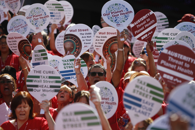 Registered nurses with the California Nurses Association/National Nurses Organizing Committee march during a rally on the Strip near Planet Hollywood casino-hotel in Las Vegas Wednesday, Sept. 24, 2014. Registered nurses and health workers participated in the action on the Strip to highlight the need for more support to combat infectious diseases around the world such as the Ebola outbreak. (Erik Verduzco/Las Vegas Review-Journal)