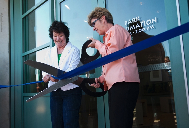 Clark County Commissioners, from left, Mary Beth Scow and Chris Giunchigliani cut the ribbon during the grand opening and dedication of the new Nature Center at the Clark County Wetlands Park on Saturday. The 45,000-square-foot complex also features an 85-seat auditorium and information center at the park, the county's largest and most rustic, located at 7050 Wetlands Park Lane, about one mile east of Boulder Highway off Tropicana Avenue.