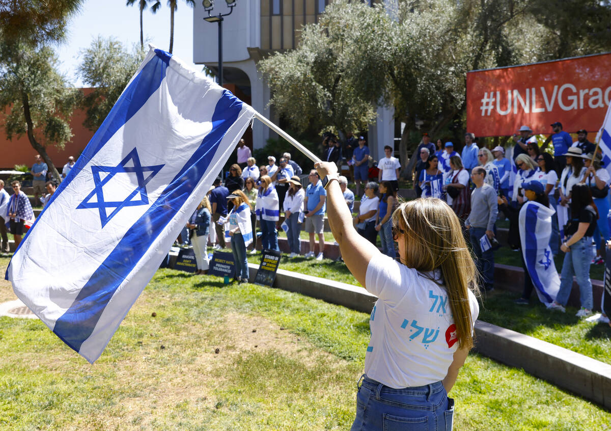 Levaton was joined by several hundred other people on UNLV’s campus on Monday for a rally against antisemitism that was organized by local Jewish and Israel advocacy groups including the Israeli American Council, Hillel Las Vegas, Jewish Nevada and others.
