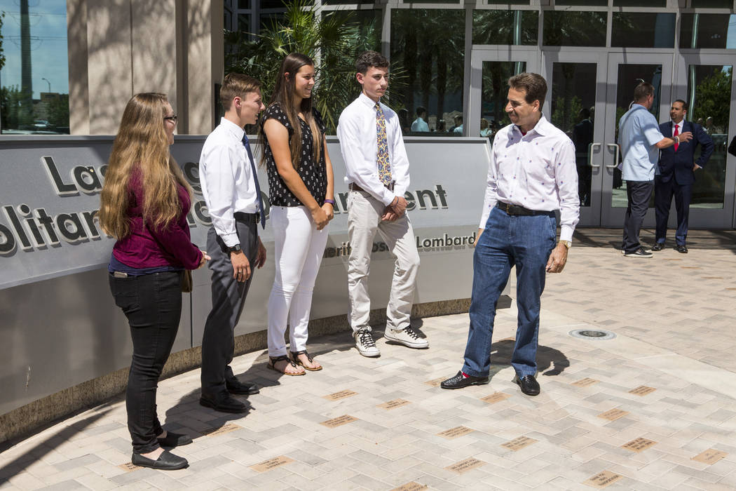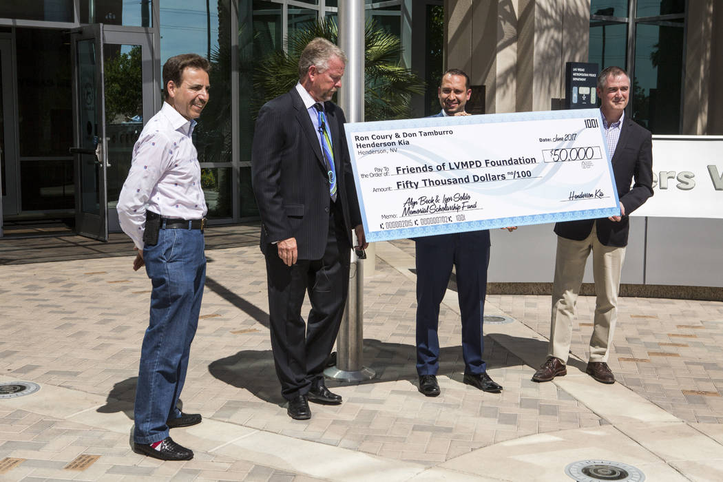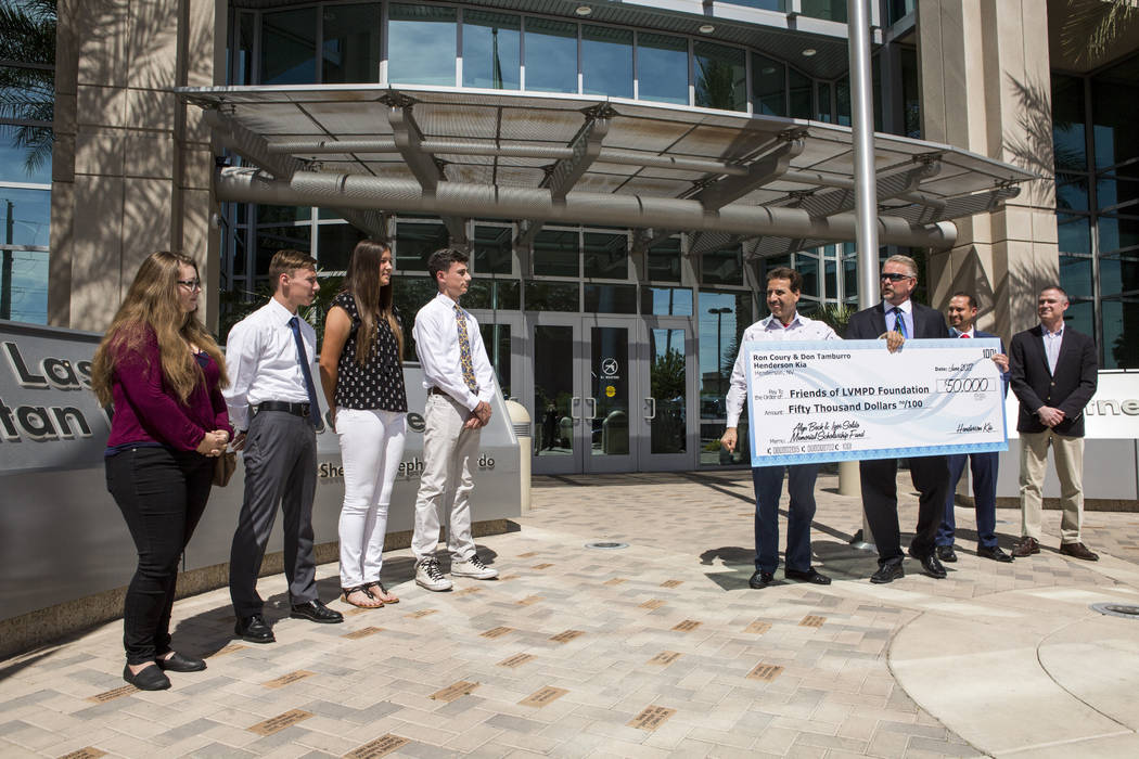 A handful of the scholarship recipients gathered Wednesday morning in front of Metropolitan Police Department headquarters for a short ceremony. Don Tamburro and Ron Coury, who own Henderson Kia, gave $50,000 to the Friends of Las Vegas Metropolitan Police Department Foundation for the scholarship, now in its third year.