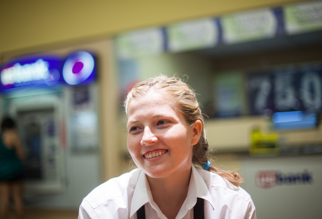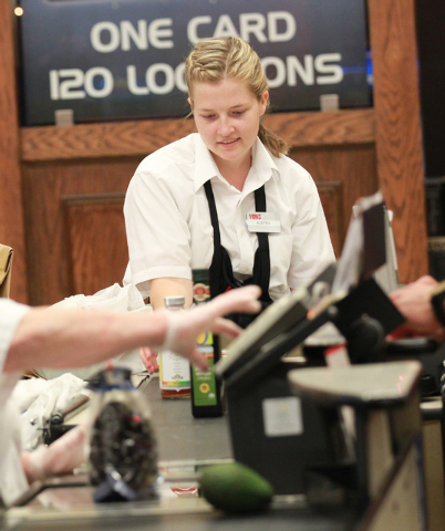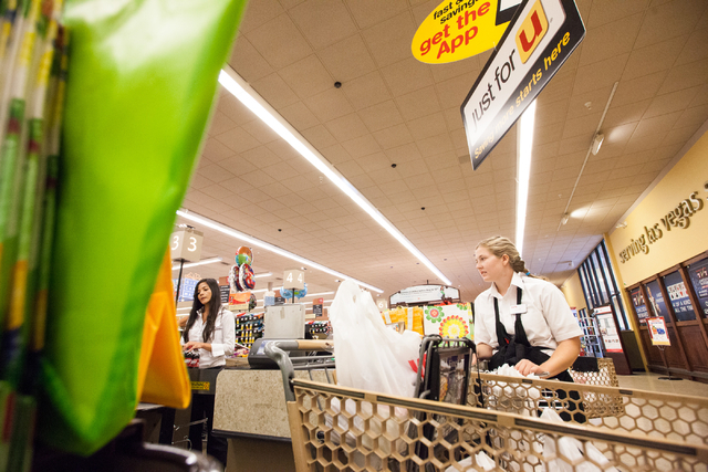 In a southwest Las Vegas Valley grocery store, a young woman with a blond ponytail bags potato chips and apple juice with a smile.