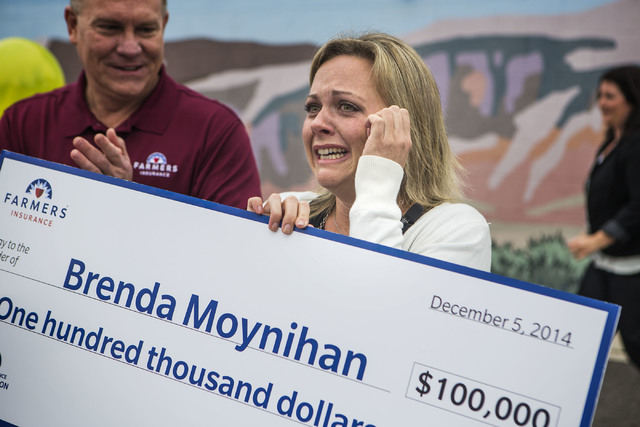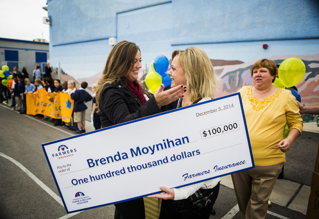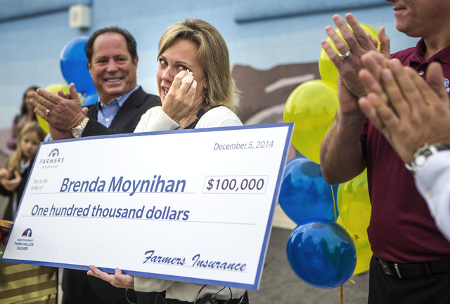 “Why don’t you come up, Brenda,” said Bob Compan, Farmers Insurance manager of government and industry affairs, ushering Moynihan across the school’s blacktop to accept the oversized check hidden behind a piece of cardboard.