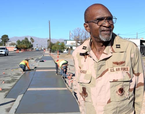 And what he's seeing this December afternoon certainly is a good thing. Workers of Capriati Construction are on their knees, across from his G Street house, planing wet concrete that soon will harden into the first sidewalk ever in this hardscrabble area of west Las Vegas.