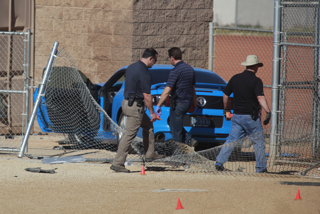 A light blue Ford Mustang crashed through a fence bordering the field and came to rest at the back wall of a baseball dugout. A black Chevrolet Camaro went through the same fence about 100 feet east of the Mustang and turned onto its side on the field.
