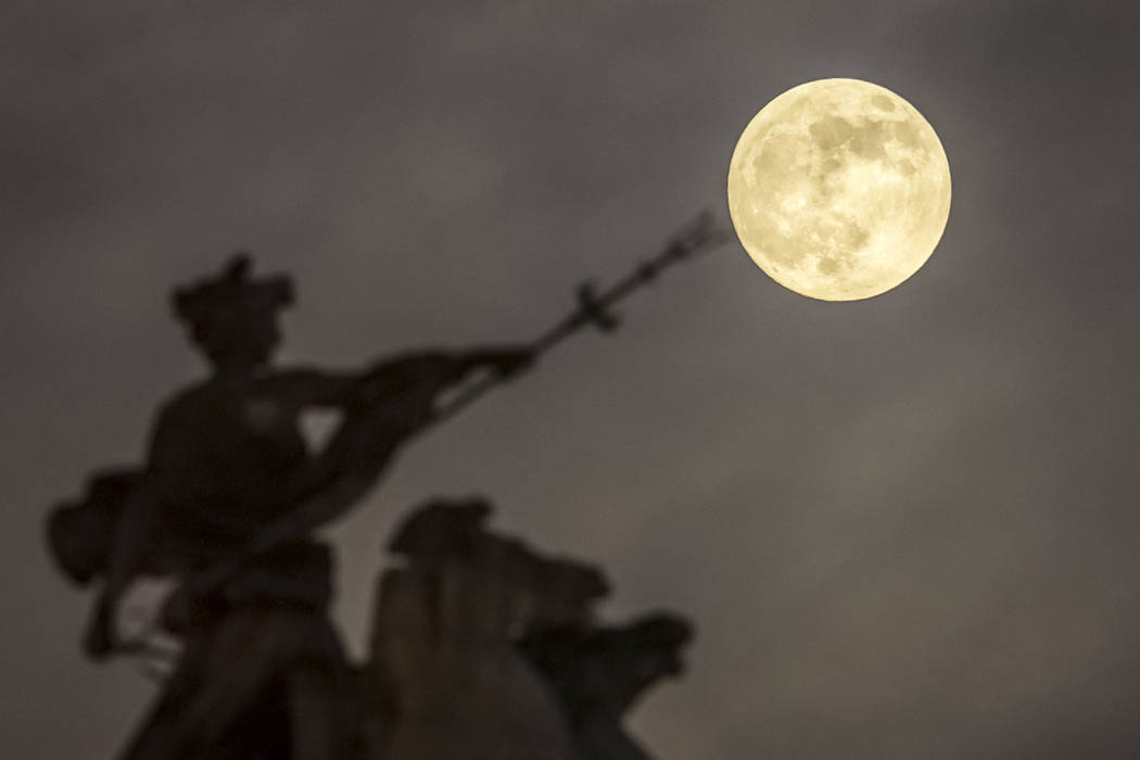A super moon rises above the ‘Maritime Prowess’ by Albert Hemstock Hodge on the Guild Hall ahead of the Lunar Eclipse, in Hull, England, Sunday, Jan. 20, 2019. (Danny Lawson/PA via AP)