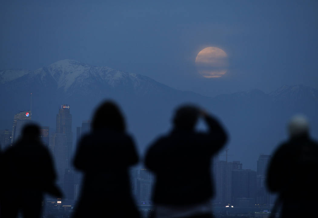 People watch the supermoon rise behind the downtown Los Angeles skyline, from Kenneth Hahn Park in Los Angeles, Sunday, Jan. 20, 2019. The year’s first supermoon, when a full moon appears a little bigger and brighter thanks to its slightly closer position to Earth, is one of two lunar events Sunday. If skies are clear, a total eclipse will also be visible in North and South America, and parts of Europe. (AP Photo/Ringo H.W. Chiu)