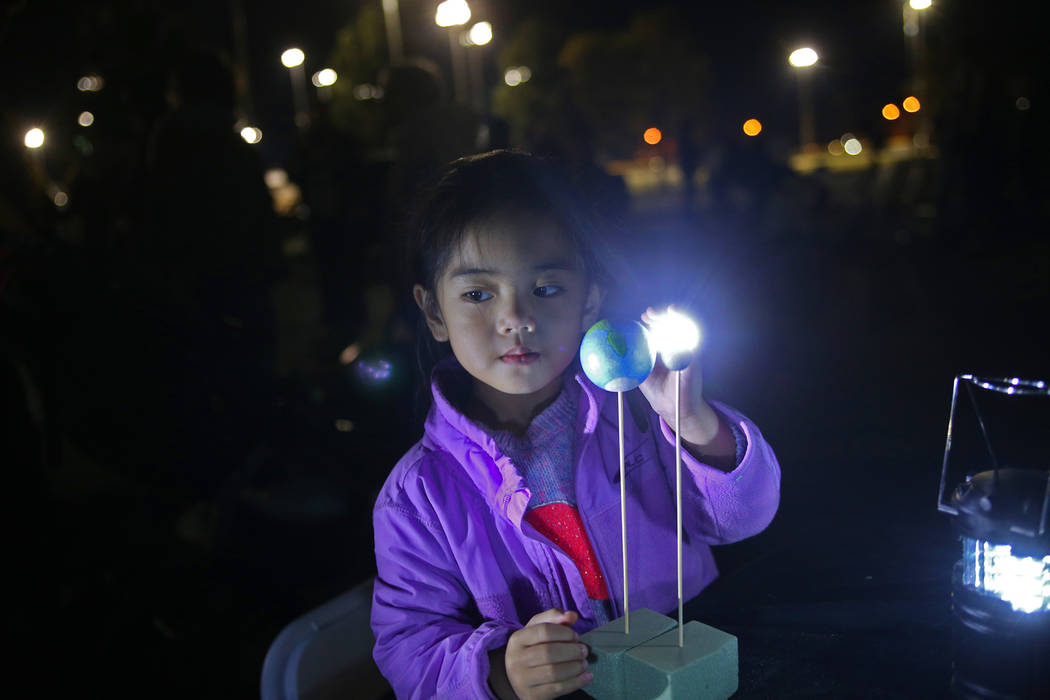 Raema Macababbad, 3, participates in a project to show children how the lunar eclipse works at the lunar eclipse viewing hosted by the Las Vegas Astronomical Society at the College of Southern Nevada parking lot in North Las Vegas, Sunday, Jan. 20, 2019. (Rachel Aston/Las Vegas Review-Journal) @rookie__rae