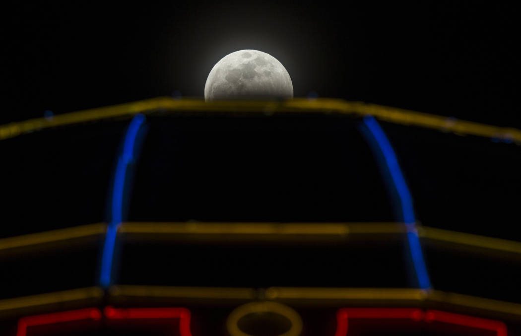 The "super blood wolf moon" lunar eclipse is seen above Paris Las Vegas on Sunday, Jan. 20, 2019, in Las Vegas. (Benjamin Hager/Las Vegas Review-Journal) @BenjaminHphoto