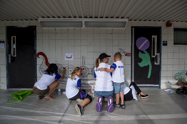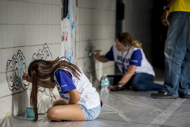 More than 400 volunteers from Las Vegas-based TELUS International, a global business process outsourcing services provider, were busy painting the basketball court and murals along the atrium walls, building benches and expanding the school’s learning garden.