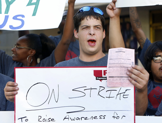 Thousands of fast-food workers walked off their jobs Thursday in 150 cities around the country to fight for a $15 an hour wage, and 10 protesters in Las Vegas were cited after strikes at a McDonald’s near Harrah’s on the Strip.
